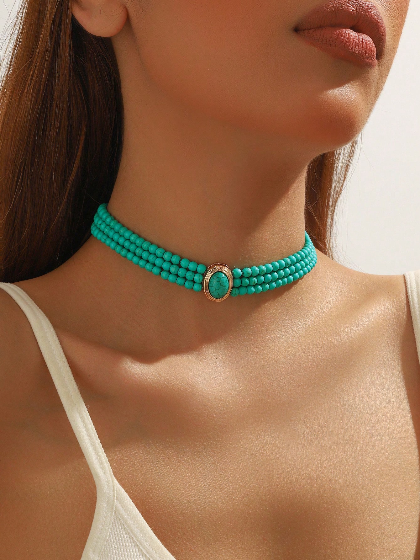 1pc Elegant French Short Multi-Layer Turquoise Beaded Choker Necklace For Women BY SHEIN