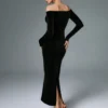 Poéselle Women Black Velvet Long Dress Red 3D Flower Decor Off Shoulder Long Sleeve Dress BY SHEIN