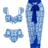 SHEIN Swim Oasis 3pcs/Set Women Knit Swimwear With Ruffled Spaghetti Strap Backless Top