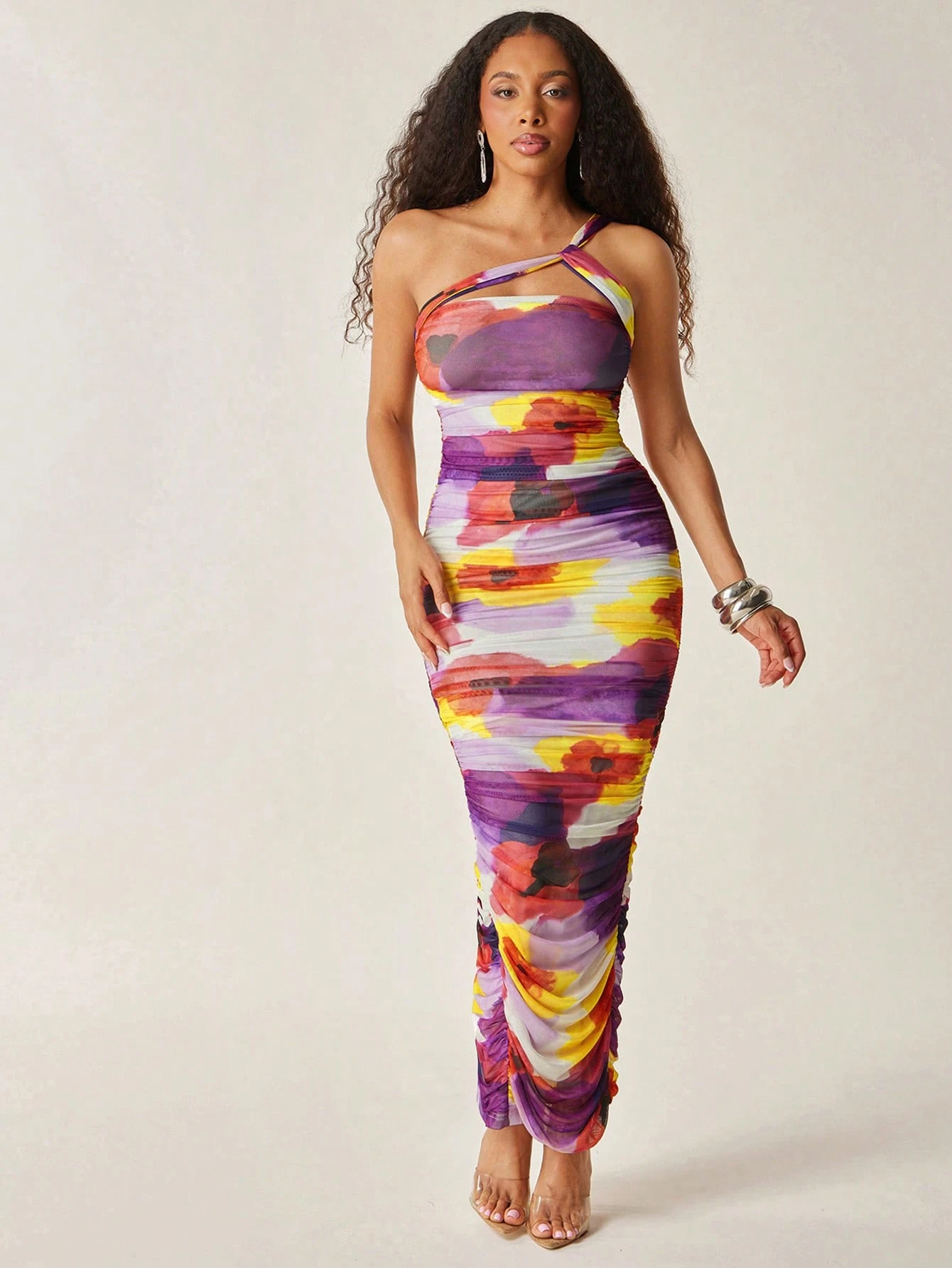SHEIN Vixey Fully Lined Floral Print Mesh One Shoulder Ruched Maxi Dress