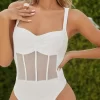 Details: Contrast Mesh, Sheer, Ruched Bust